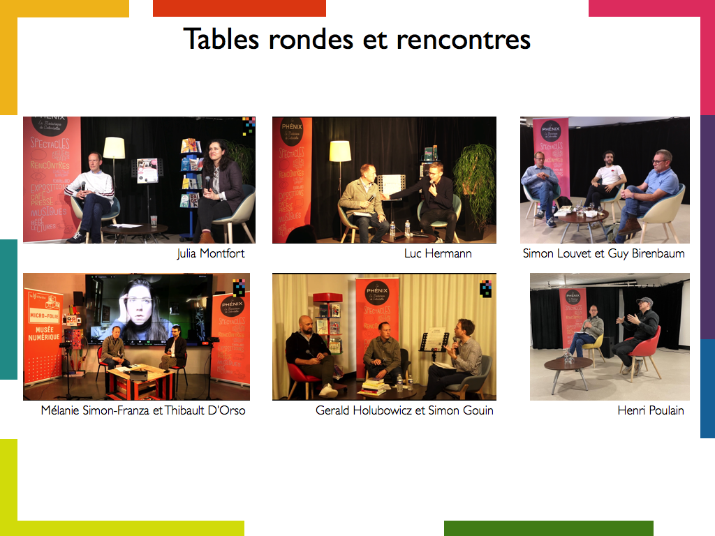 Conception et animation de tables rondes sur différents enjeux liés aux médias, à l’information et au numérique. Exemples : * Rencontre avec Guy Birenbaum et Simon Louvet (émission enregistrée avec les auteurs avant la rencontre avec le public) * “La visibilité et l’impact des films et des séries”, avec Mélanie Simon-Franza et Thibault D’Orso (captation audiovisuelle) |